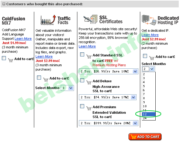 3. 在上图的Dedicated Hosting IP部分,选择要购买几个月的独立IP,如果要购买一年就选择12(如上图绿色椭圆线所示),点击红色按钮 ADD TO CART。