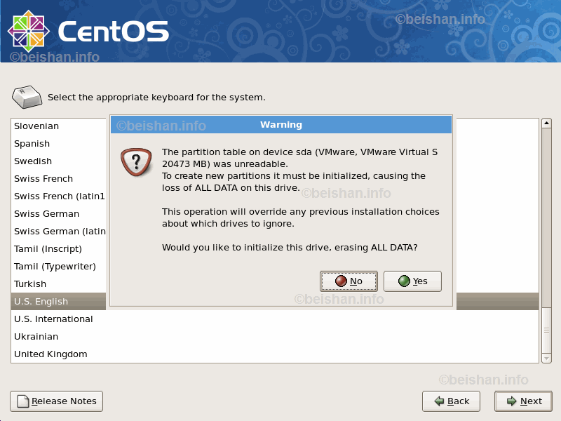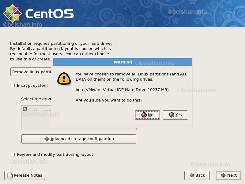 如果你是新创建的虚拟机,你会看到上面的信息,选择 Yes 就可以了。但是如果你所选择的是已经安装过CentOS的虚拟机,就会出现下面的信息: