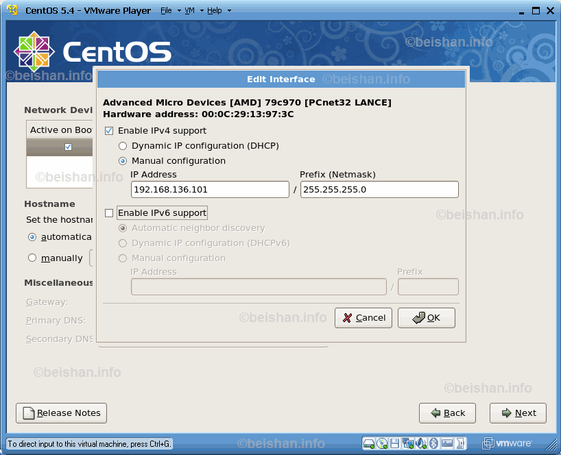 输入你要设定的IP,这里假定演示使用的IP为: 192.168.136.101。缺省是使用IPv6的,如果不需要的话去掉该选项。然后点击 OK