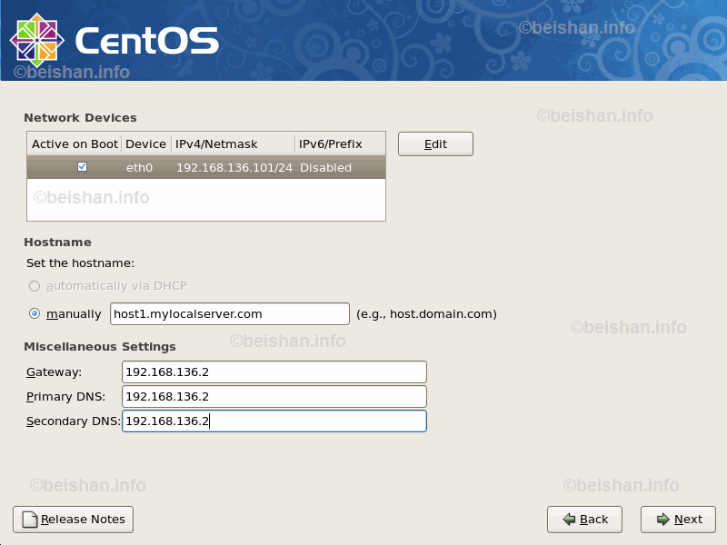 这里先做一些假定:安装后的 CentOS 系统的虚拟机的域名为:host1.mylocalserver.com,IP为: 192.168.136.101,网关和DNS的IP都为:192.168.136.2。你的系统的实际IP会有所不同,你可以用自己查看一下。