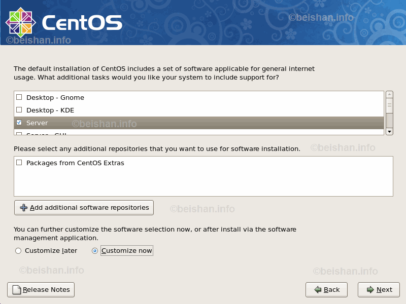 因为我们这里安装的系统是要作为服务器使用,所以当然选 Server, 再选 Customize now, 然后点击 Next
