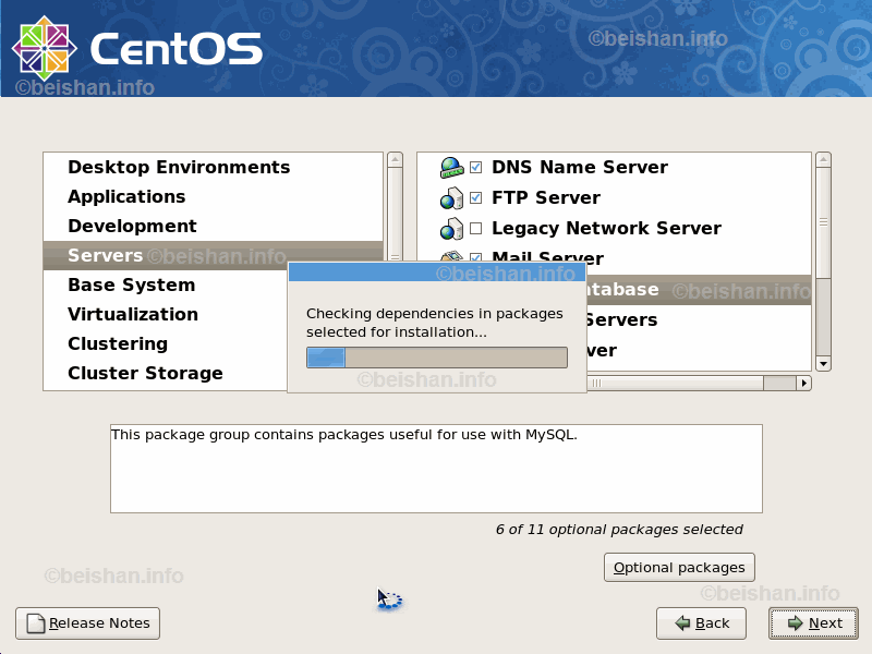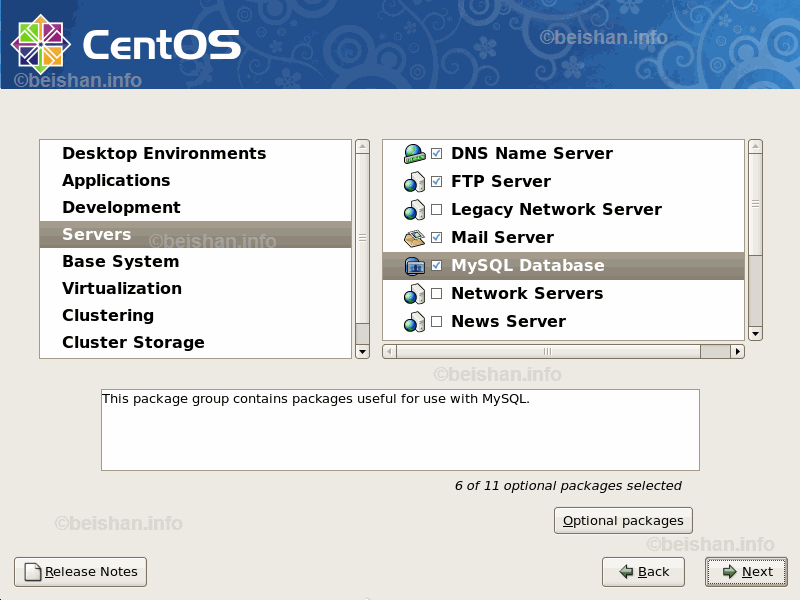 这里再对需要安装的软件做一个选择。选择如下软件: Editors, Text-based Internet, Development Libraries, Development Tools, Administration Tools, Base, and System Tools。如果希望把CentOS带的服务器软件都一并安装的话,再选上DNS Name Server, FTP Server, Mail Server, MySQL Database, Server Configuration Tools, Web Server。其它的软件就都不需要了。选择好后点击 Next