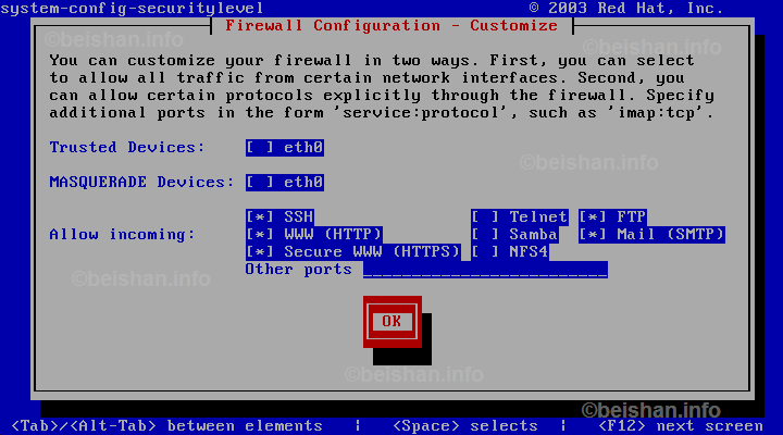 取消 SELinux。因为可能有些软件在使用过程中会有问题。如果不想使用防火墙的话,Security Level 选 Disabled,然后点OK。如果要使用防火墙,则Security Level 选 Enabled,然后选择Customize,就会出现下面的对话框: